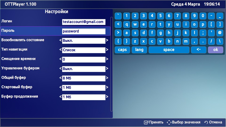 Здесь можно также настроить дополнительные опции. Изменение каждой опции завершаем нажатим OK на пульте. Для сохранения полей, таких как логин и пароль, выбираем стрелками кнопку OK на экранной клавиатуре и нажимаем OK на пульте. Если после изменеий любого пункта нажать Back на пульте, изменения для выбранного пункта не сохранятся.