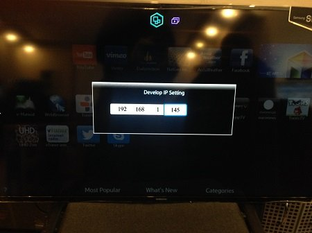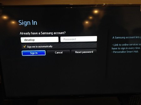 В открывшемся окне вводим логин develop, пароль - не нужен - внизу ставим галку и нажимаем Sign in. Далее: заходим в Смарт Хаб - направляем синее поле луча пульта на одно из приложений - нажимаем центральную кнопку-крестовину пульта и удерживаем ее до появления Меню синхронизации.